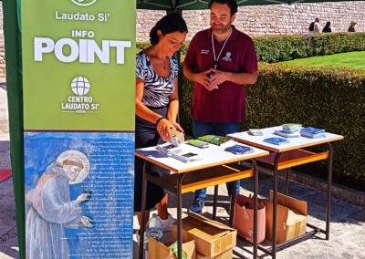 Nella parte centrale di Tempo del Creato, il Centro Laudato Si’ è stato coinvolto nei due grandi eventi di Assisi: la festa del Cantico, a San Damiano, per gli 800 anni della composizione, e il Cortile di Francesco, dal titolo “CreAzione” proprio in riferimento al Cantico e alla creatività in senso più ampio. I Volontari hanno garantito il servizio sia a San Damiano, in supporto al programma proposto dai frati OFM, sia sul prato di San Francesco con l’InfoPoint sulla sostenibilità e nella promozione del programma fitto di eventi al Sacro Convento.