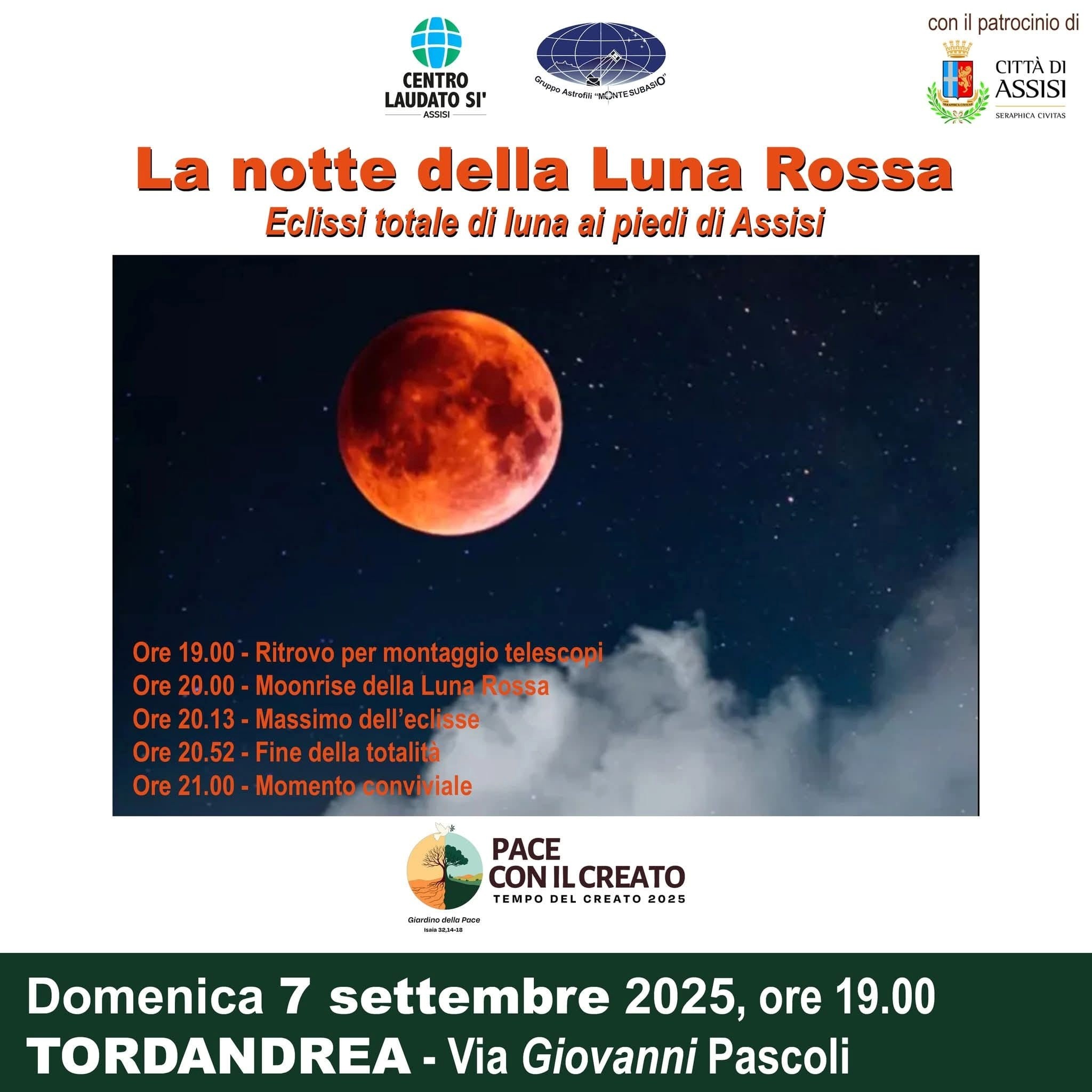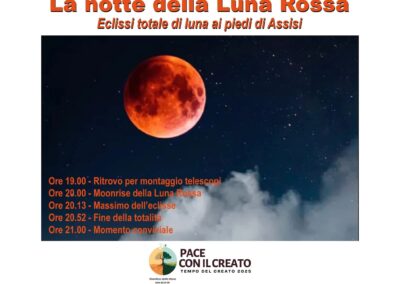 Il 7 settembre abbiamo vissuto un evento astronomico e comunitario molto bello, “La notte della luna rossa”, con l’eclissi totale di luna. L’evento, organizzato insieme al Gruppo Astrofili del Monte Subasio, ha visto una bella partecipazione di pubblico e un’atmosfera di grande cordialità, anche se alla fine, per il cielo nuvoloso, lo spettacolo della luna si è potuto gustare solo in parte. Resta che la luna ci ha consentito di vivere tutti una bella serata in compagnia, contemplando le stelle.