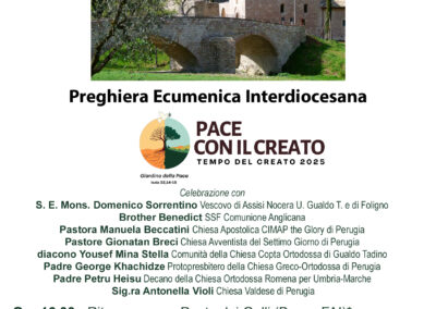 Il ricco programma svolto lungo tutto il mese ha visto un grande coinvolgimento, utilizzando diversi linguaggi. Il primo evento si è svolto il 31 agosto, quasi come una “anteprima” di Tempo del Creato, con la Preghiera ecumenica interdiocesana, organizzata dalle tre diocesi di Assisi, Foligno e Perugia, insieme a diverse chiese “sorelle” del territorio e tanti ordini religiosi e associazioni, nella splendida cornice del Bosco di San Francesco del FAI. La preghiera è stata guidata dalla Via Creationis composta dalle varie chiese (link).